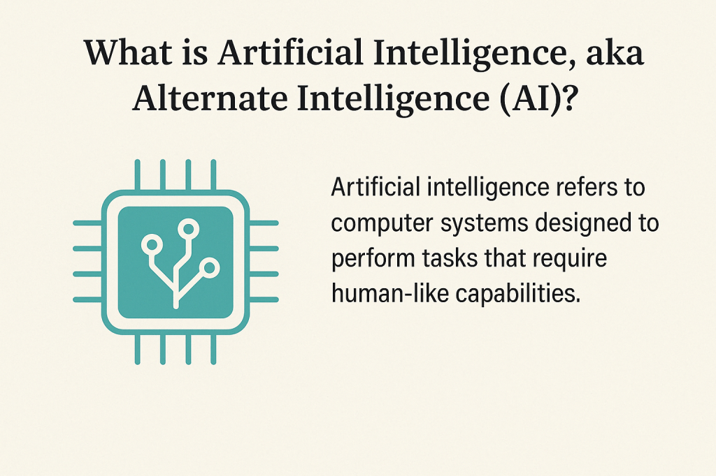 Artificial Intelligence aka Alternate Intelligence (AI) refers to the development of computer-based systems capable of performing tasks that typically require human intelligence, such as reasoning, learning, decision-making, and perception.